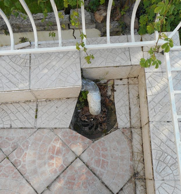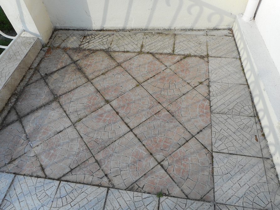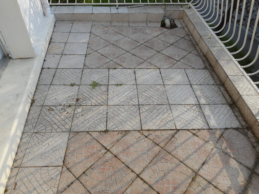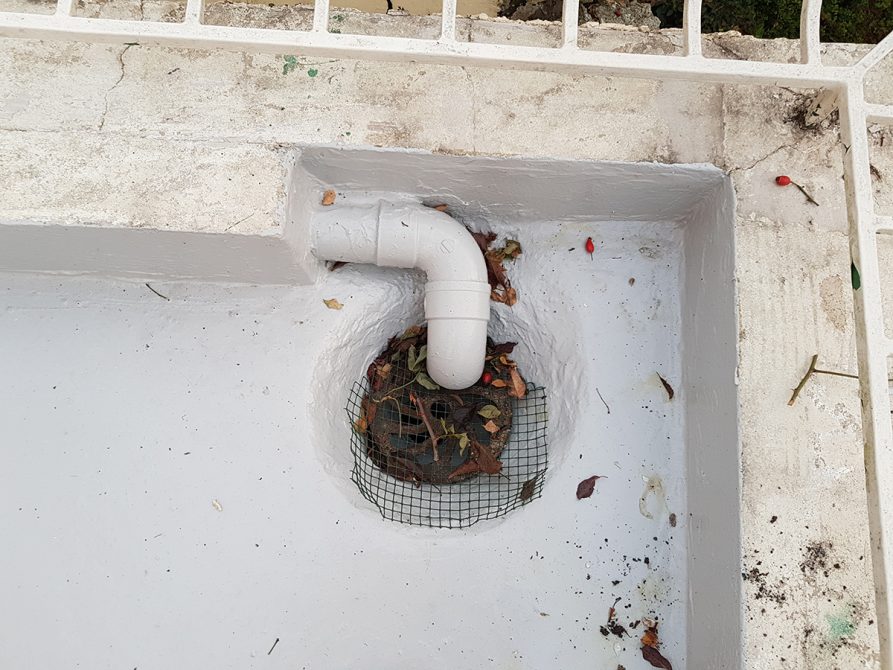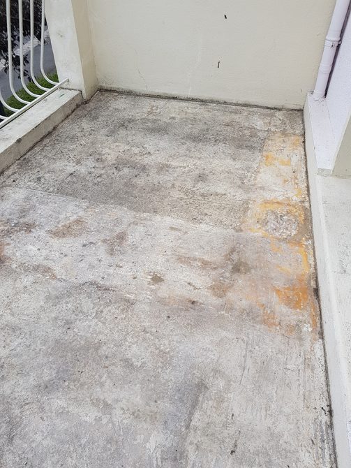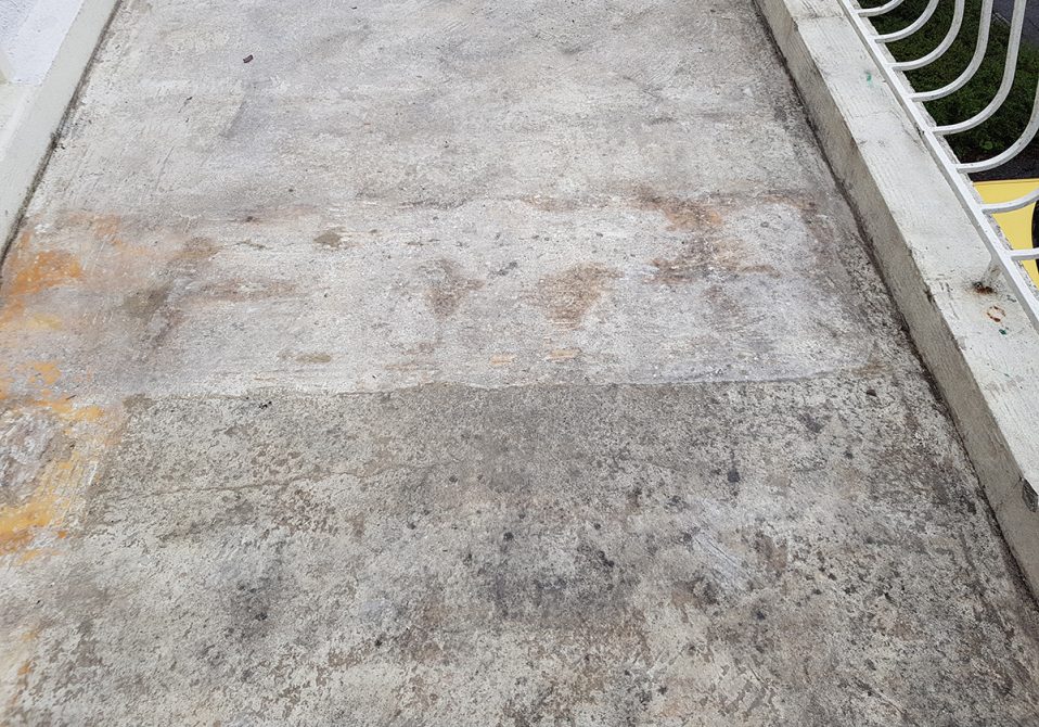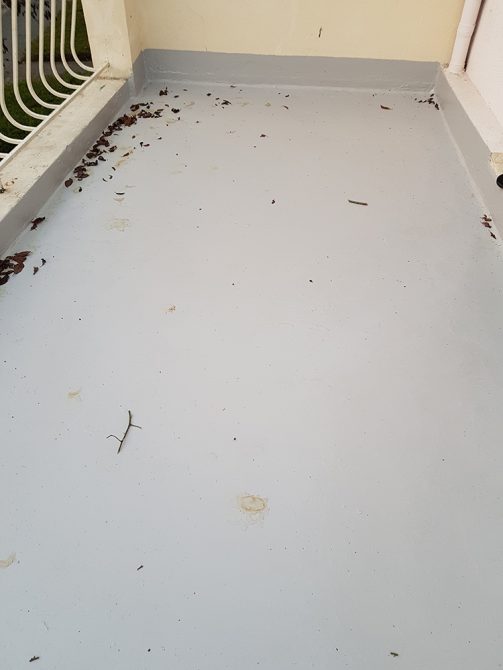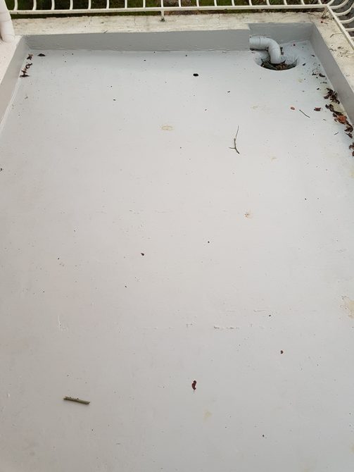 Nous avons opté pour une dépose totale du revêtement, grattage des résidus de colle. Mise en place d’une résine type flashing (étanchéité Alsan) liquide avec des relevés.