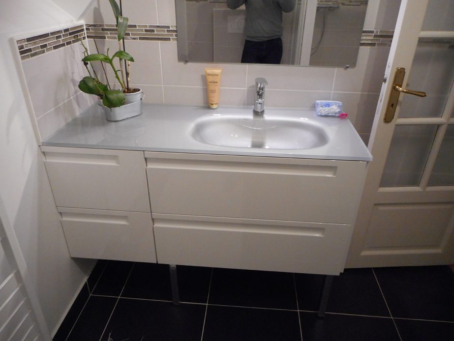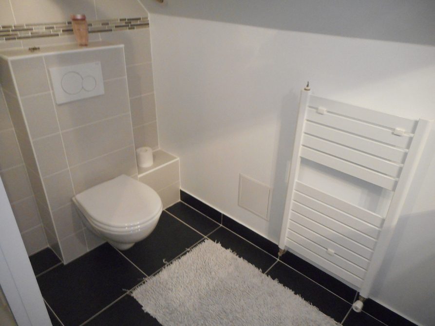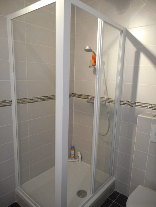 Nous avons opté pour un toilette suspendu (Geberit) qui pouvait se confondre dans la masse et une cabine de douche verre transparent (Fordham) pour la fluidité avec de porte coulissante pour gain de place, receveur acrylique (Jacob Delafon), ensemble de douche thermostatique (Hansgrohe) pour le coût.
