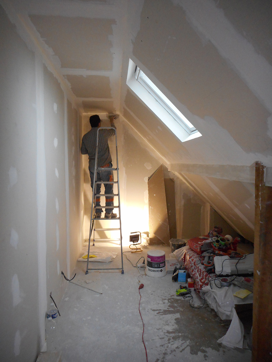 La société leur a proposer d’aménager les combles avec une ouverture du plancher (trémie), mettre un escalier sur mesure et une ouverture toiture (fenêtre de toit pour avoir de la luminosité naturel et reprendre des ligne électrique pour création d’un réseau selon la norme C15-100 point lumineux, prise électrique et chauffage.
