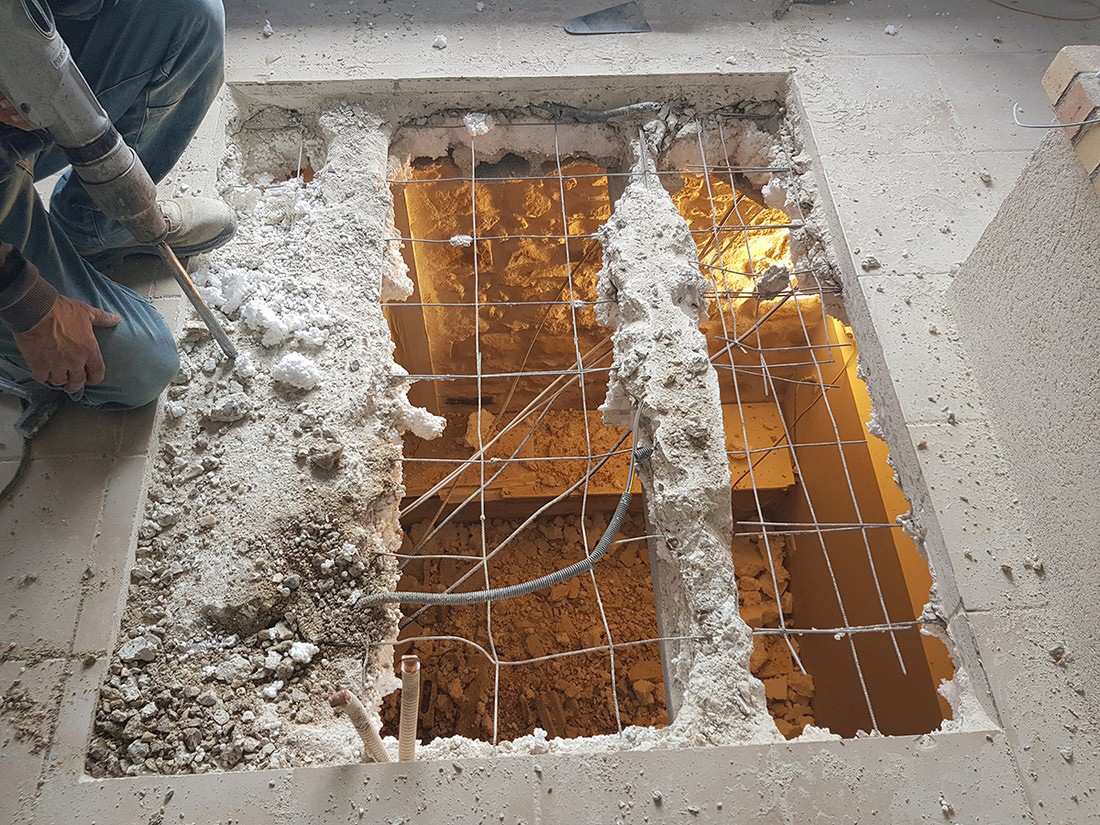 Pour cela nous avons du protéger le sol, étayé le plancher poutrelle hourdis afin de pouvoir découper au disque diamant en toute sécurité.