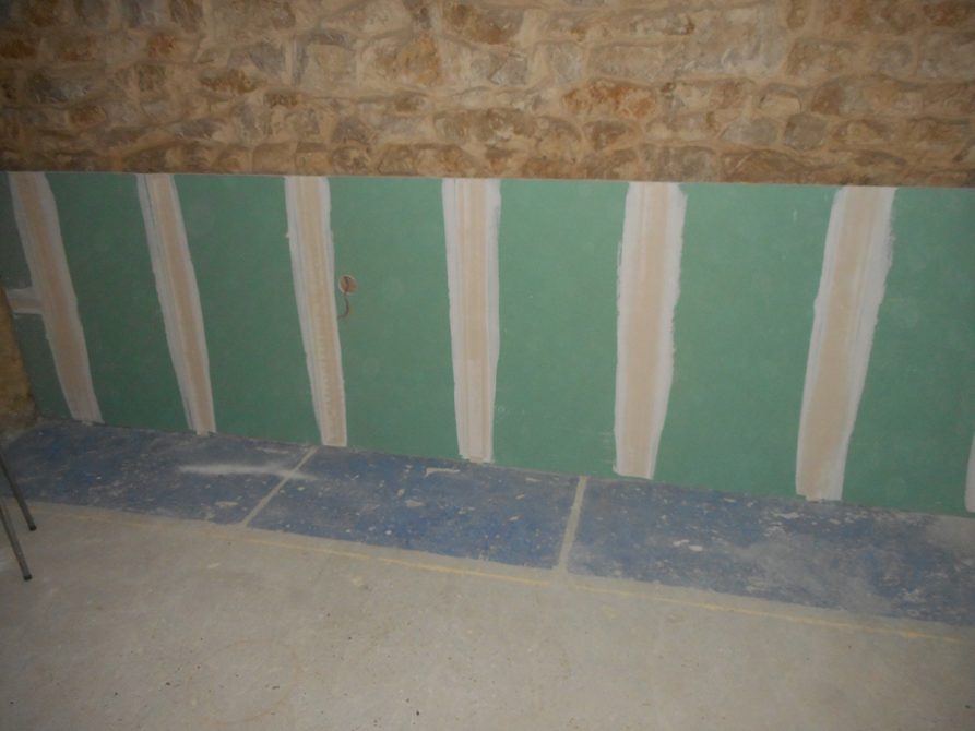 L’autre partie la mise en place d’une ossature métallique (rail, montant) avec laine de verre ou roche selon les choix thermique et phonique, jointoiement des plaques avec bande, enduit deux passes.