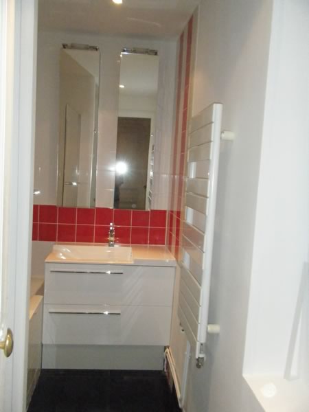 Rénovation salle de bain 75009 Paris. La cliente cherchait à optimiser les encombrements afin de perdre le minimum de place mais son exigence était d’avoir une baignoire avec un meuble vasque. Il a fallut revoir les emplacements, le réseau plomberie et électrique.